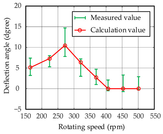 It can be observed in Figure 11 that there is a certain error between the measured and the calculation value of the average deflection angle of broken particles in the experiment. The maximum error occurs when the speed of the main shaft is 272 rpm, the positive error is 4.2°. The minimum error occurs when the speed of the main shaft is 501 rpm, the negative error is 0.3°. The error occurs because particles are fed into the one-side crushing chamber, the crushing chamber is not completely full, and the rotating speed of the main shaft is not precise enough to be adjusted through the inverter. Although the control of the experiment is not perfect and results in some errors, the variation trend of the measured values is consistent with the calculation value, and the average error between the two is 1.1°, indicating that the feasibility and effectiveness of the improved model are verified.