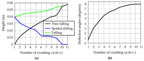 As shown in Figure 14a, as the number of crushing cycles increases, the height of falling and free-falling in each crushing cycle increases, and the height of spatial sliding decreases. In the 10th and 11th crushing cycles, the curve of the falling height coincides with the curve of the free-falling height. The main causes of these trends are determined by the motion characteristics of the particles. With the continuous crushing of particles, the motion characteristics of particles gradually change from spatial sliding to spatial compound falling. Additionally, the spatial sliding component of the spatial compound falling is decreasing. As a result, the height of free-falling increases and the height of spatial sliding decreases. In the 10th and 11th crushing cycles, the motion characteristics of the particles become free-falling, the height of the spatial sliding decreases to 0. Then the curves of the falling height and the free-falling height coincide. As shown in Figure 14b, the circumferential deflection angle of particles increases as the number of crushing cycles increases. However, the curvature of the circumferential deflection angle curve decreases continuously until it reaches 0 in the 10th and 11th crushing cycles. The reasons for this change are as follows: as the number of crushing cycles increases, the motion characteristics of particles are spatial sliding in the process of falling. In each spatial sliding, the particles deflect circumferentially around the central axis of the cone crusher. With the accumulation of circumferential deflection, the circumferential deflection angle of particles increases continuously. In the 10th and 11th crushing cycles, the motion characteristics of the particles become free-falling, so the particles do not deflect around the central axis of the cone crusher, then the curve has a straight-line section.