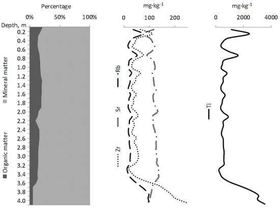 The data show that Lake Didžiulis was not influenced by such significant sedimentation changes as Lake Balsys since the ratio of organic and mineral matter remains constant along the entire sediment core (Figure 4). The values of chemical elements such as Zr, Sr, Rb and Ti reveal slight changes. Only the top-most layer is slightly enriched with Zn which reaches 114.8 mg·kg−1 but does not exceed the MAC. Other heavy metals were not detected as concentrations were lower than the detection limit. Most of the chemical elements in sediment core are strongly associated with organic matter (r values varies from 0.75 to 0.98, p < 0.05). The reduced form of Fe is less stable in the water column than that of Mn and consequently Mn/Fe ratios in the sediments are low when the sediment becomes anoxic [36,37,38]. In this lake, the ratio of Mn/Fe is rather constant showing that sediments were formed in similar redox conditions with a trend towards lowering of oxygen concentrations, which could be due to eutrophication and changes in water level during recent decades. Only the upper layers have a higher ratio of Mn/Fe, which could be because this lake was dammed raising the water level, thus giving a higher saturation of oxygen.