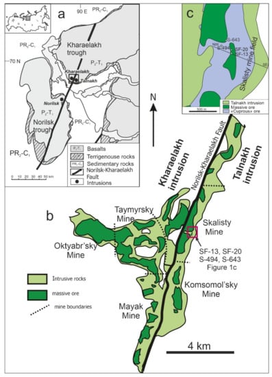 Schematic geological map of the Norilsk–Talnakh district (a) and surface projection of the Talnakh and Kharaelakh intrusions modified from [], including the location of the Skalisty mine (b) and the sampling location (c).