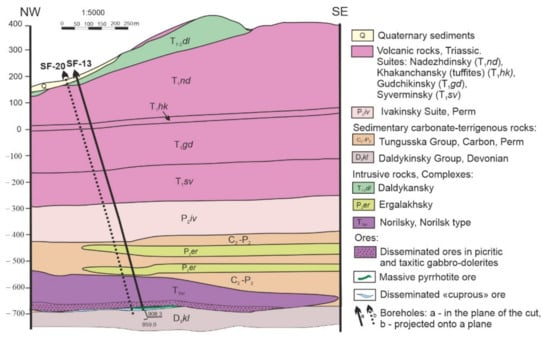 Geological cross-section of the Talnakh intrusion (northwestern branch) showing the position of the SF-13 and SF-20 boreholes.