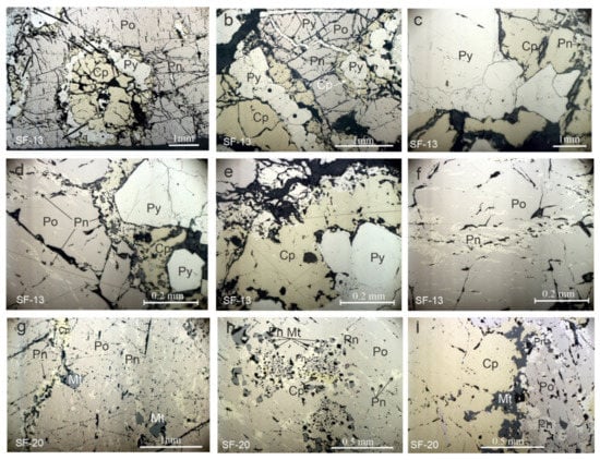 Large pyrite grains occur forming chains or tails of individual crystals along the margin of chalcopyrite segregations (Figure 3a), SF-13 sample. Pyrite is normally restricted to the border of chalcopyrite and never crosses or penetrates it (Figure 3b,c). Pentlandite in these ores appears subordinate, represented by three modifications: thin lamellas or dendritic crystals in pyrrhotite (MSS exsolution) (Figure 3d,f–h); thin rim-like precipitates at the contact between pyrrhotite and chalcopyrite (Figure 3a,b); and ribbon-like accumulations of grains confined to chalcopyrite clusters (Figure 3g,i). Magnetite occurs as isometric and rounded inclusions, and sometimes subhedral, restricted to chalcopyrite–pentlandite segregations (SF-20).