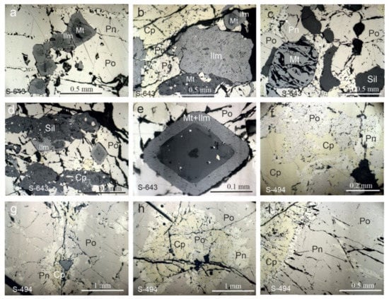 Textures and parageneses of sulfides in massive ores from boreholes S-643 (a–e) and S-494 (f–i), reflected light. (a) Magnetite (Mt)–ilmenite (Ilm) zoned grains together with pentlandite veinlets in pyrrhotite (Po); (b) ilmenite-grain-bearing sphene and perovskite lamellae and sulfide microinclusions; (c) droplet-shape magnetite grain in a sulfide matrix composed of pyrrhotite (Po), pentlandite (Pn), and chalcopyrite (Cp); (d–e) crystals of ulvospinel with apatite in core, surrounded by a zone of magnetite–ilmenite (Mt + Ilm) exsolutions; (f–i) chalcopyrite segregations surrounded by a rim of pentlandite, in pyrrhotite.
