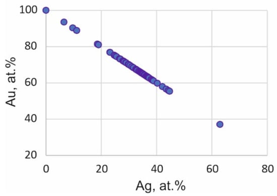 Maucherite contains Pd as a minor element in the range 1.61–4.31 wt.% (Table 3). These Pd contents were obtained in large homogeneous grains. Another ubiquitous minor element in maucherite is Co, which occurs in the range 0.21–0.89 wt.%. An intermediate composition between menshikovite and majakite has also been established (Figure 5b). Nickeline is a much less common phase, but may also contain Pd up to 0.38 wt.%. Other PGMs are less diverse in composition: cooperite, sobolevskite, sperrylite, mertieite II, stibiopalladinite, and isoferroplatinum. Sobolevskite contains about 20 mol.% of sudburyite. Mertieite II is characterized by a constant composition with an approximate formula Pd8Sb2.5As0.5. Isoferroplatinum is stoichiometric; cooperite contains Pd and Ni, less than 1 wt.% each (Table 4). Stibiopalladinite inclusions are too small to be quantified as well as the Au–Ag alloys. Several analyses for gold–silver alloys were obtained by removing matrix elements (Ni, As) and recalculating to 100 at.%. As a result, it was established that the compositions of Au–Ag alloys vary widely from 38 to 100 at.%, Au showing the most distinctive fineness 55–77 at.% (Figure 9).