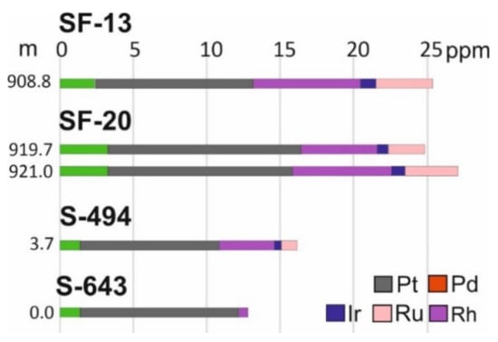 The singular geochemical characteristics of the massive ores of the Skalisty mine according to Norilskgeologiya LLC (internal report) were presented earlier in [,] and in this study, shown in Table 5 and Table 6. The high contents of PGEs (14–32 ppm), a significant proportion of which are IPGE and Rh have been found exclusively in massive exocontact ores of the Skalisty mine (Figure 10), which may represent a typomorphic feature. Additionally, these ores are nickel-rich (Ni content ranging 4.8–5.95 wt.%, and Ni/Cu ratios varying from 1.3 to 1.9. The total Contents of PGE vary in a range 14–32 ppm; palladium prevails over platinum, Pd/Pt ratios are 7–8 in massive chalcopyrite–pyrrhotite ores of the S-643 and S-494 boreholes, while these ratios range from 4 to 4.5 in SF-13 and SF-20 boreholes. The high IPGE contents—Ru up to 3.84 ppm and Ir up to 1.10 ppm, and Rh up to 7.31 ppm (Table 6)—are higher than the previously described by []. The Contents of Ir + Ru + Rh in 100% sulfide varies in the range 5.3–15.5 ppm (SF-13, SF-20, and S-494), and do not exceed 1 ppm in the massive ore of the S-643 borehole. The ratios (Pd + Pt)/(Ir + Ru + Rh) or PPGE/IPGE + Rh in samples of massive ores present low values for most samples (1–2), and it corresponds to 37 for the S-643 borehole.