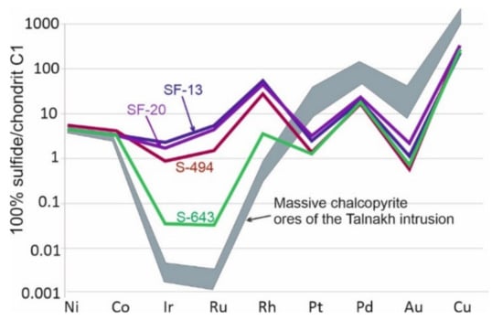 Plots of 100% sulfide/chondrite C1-normalized [] average tenors of chalcophile elements in massive ores. Gray area—massive chalcopyrite ore of the Talnakh intrusion, Southern-2 orebody (Yz-5 and Yuz-12 samples) [].