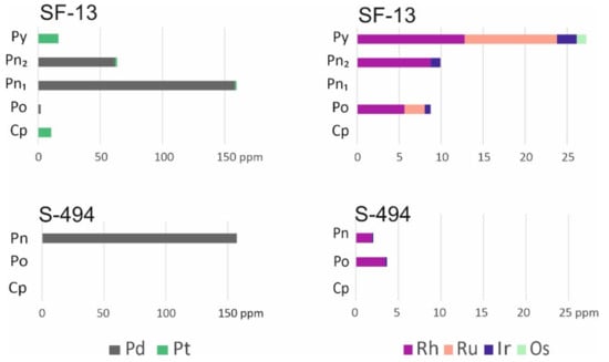 PGE content in BMS for the selected samples: SF-13—pyrrhotite ores (Cu-poor) and S-494—chalcopyrite–pyrrhotite (Cu-bearing), average values in the mineral, presented in Table 6.