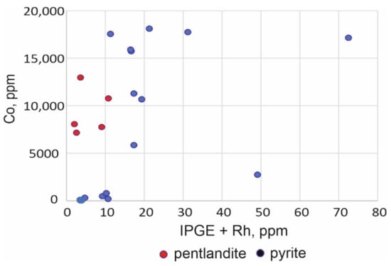 In addition, it should be noted that the maximum Rh contents in pyrite coincide with the Co-enriched zones shown in Figure 7. Moreover, weak positive correlation between the Co and IPGE + Rh grades in pyrrhotite and pentlandite is evident (Figure 13).