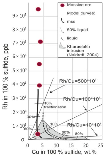 Variations in Rh content relative to Cu for different samples of the Skalisty mine compared with data from the Norilsk region concerning model curves of Rayleigh fractionation [].