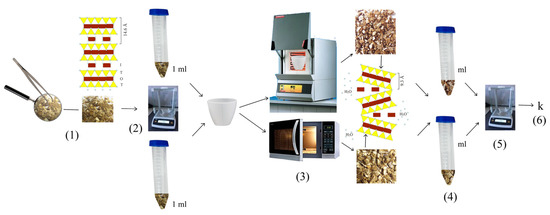 Illustration of the expansibility. (1) Cleaning of vermiculite by hand-picking of minerals other than vermiculite. (2) Weight of the raw sample occupying a volume of 1 mL. (3) Vermiculite expansion by heating in an electric furnace at different temperatures and by microwave irradiation. (4) Measurement of the volume of the expanded vermiculite in (3). (5) Expanded vermiculite weighing. (6) Obtaining expansibility k.