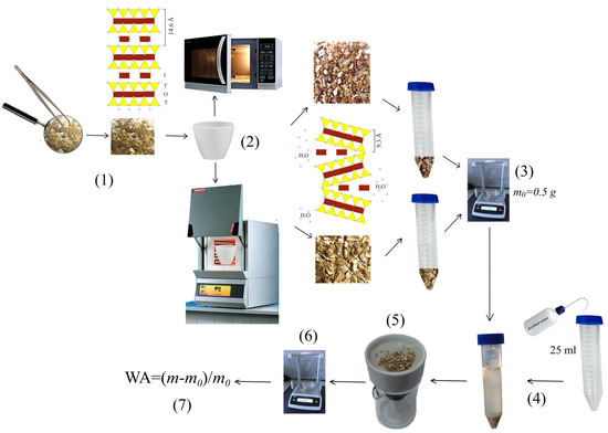 Illustration of the water immersion experiment of the vermiculite. (1) Cleaning of vermiculite by hand-picking of minerals other than vermiculite. (2) Vermiculite expansion by heating in an electric furnace at different temperatures and by microwave irradiation. (3) Weight of 0.5 g of expanded vermiculite (m0). (4) Immersion of expanded vermiculite in 25 mL of distilled water during different times. (5) Filtered and dried at room temperature (20 °C) of vermiculite. (6) Weight of vermiculite (m). (7) Obtaining WA.
