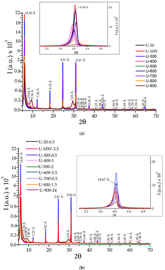 The XRD patterns performed at room temperature for the raw and treated samples are presented in Figure 5. The reflections shown in the XRD pattern of the raw vermiculite correspond to those of vermiculite (JCPDS-ICCD card No. 16-613). In the inset of Figure 4a only the principal reflection, (002), is shown (Figure 4). At room temperature (20 °C), this reflection, at 14.50 Å, corresponds to vermiculite with 2-WLHS (state of hydration with 2 water layers) and their intensity decreases with increasing temperature, until the crystalline structure practically collapses at 900 °C. The principal reflection of the U-MW sample is slightly displaced towards lower values of 2θ and has a somewhat higher intensity than that of the U-20 starting sample. In order to clearly appreciate the effect of the water immersion time of the expanded vermiculite, XRD patterns of the vermiculite expanded between 700 °C and 900 °C with the highest WA value for the investigated times are presented in Figure 4b. In addition, XRD patterns of vermiculite expanded at temperatures below 700 °C and microwave irradiated vermiculite with the lowest m-m0 value are also presented in the same Figure 4b. In the inset of Figure 4b it is observed that the intensity of the 002 reflection, at 14.67 Å, decreases in relation to that of the samples expanded and not immersed in water, and its position varies very little. In addition, the intensity of the principal reflection is greater in the expanded samples up to 500 °C not immersed in water than in those immersed; in the samples expanded at 600 °C, 800 °C, and 900 °C the opposite occurs.