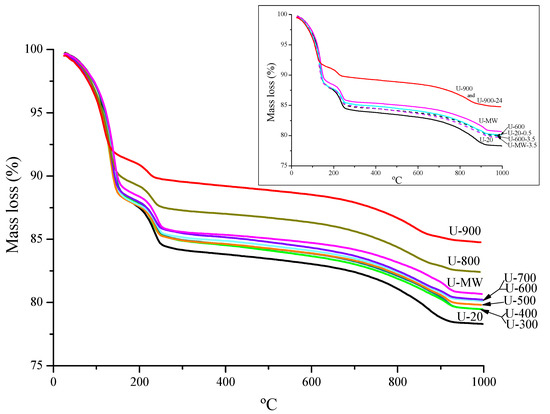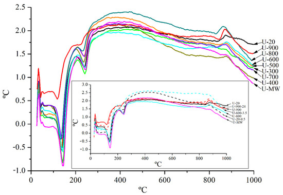 The thermal behavior of all the samples (Figure 6) is very similar. The decomposition of samples takes place in three steps. The first and second steps extends from 25 to ca. 250 °C and is due to the loss of the water adsorbed at the surface and/or located in the interlayer space as has been previously reported for vermiculite [23,24,25]. In a second step, at temperatures above 800 °C, an additional mass loss is observed. This mass loss is due to either recrystallization into new phases or a transformation process associated with the dehydroxylation of the OH- anions in the octahedral layer [19,23]. The mass loss (%) is presented in Table 4, which shows that in the first stage it is less than 16% and in the second stage it is 4.5%. Above 800 °C the mass loss in the first stage is much lower than at lower temperatures. There are some samples that depart a little from this behavior and that lose less mass in the first stage. These samples are U-800, U-900, U, U-900-24. Mass loss decreases slightly with temperature. The mass loss of the sample irradiated with microwaves is similar to that heated in an oven at 700 °C. The first mass loss stage is endothermic and the second is exothermic (Figure 7).