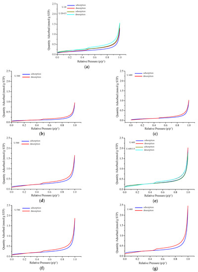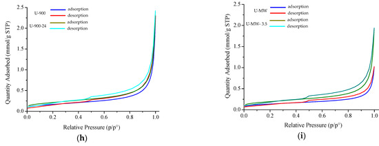 Nitrogen adsorption–desorption isotherms of raw and treated vermiculites at different temperature: (a) 20 °C; (b) 300 °C; (c) 400 °C; (d) 500 °C; (e) 600 °C; (f) 700 °C; (g) 800 °C; (h) 900 °C, and microwave irradiated (i).