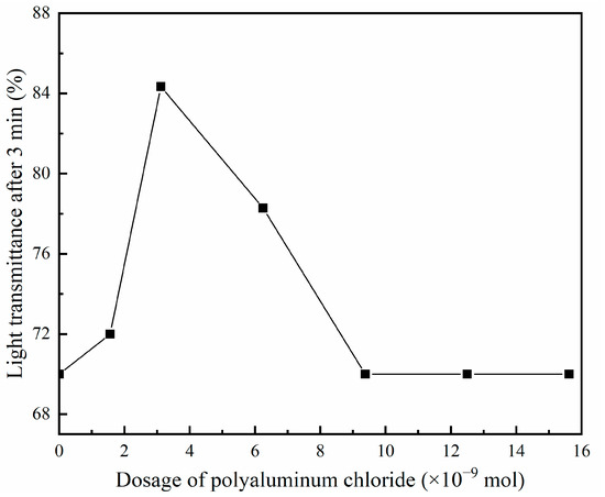 It can be observed from Figure 2 that when the dosage of PAM with molecular weight of 3 million was 0.66 × 10−10 mol, light transmittance increases initially and then decreases with the increase in polyaluminum chloride dosage. When the dosage of polyaluminium chloride increased to 9.38 × 10−9 mol, the sedimentation effect was not obvious, the stratification of coal slime water was slow, the supernatant was turbid and the light transmittance was low. When the dosage of polyaluminum chloride was about 3.12 × 10−9 mol, the sedimentation effect was the best, reaching 84.34%. After 3 h, the supernatant would be clear, and the transmittance was 98.71%. However, the settling time was too long to meet production requirements.