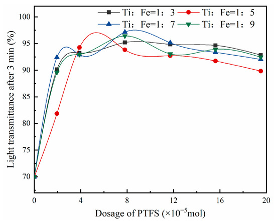 It can be observed from Figure 4 that PTFS combined with PAM can achieve a good settlement effect, and the light transmittance of coal slime water was above 90% on the whole. With the increase in PTFS content, light transmittance of coal slime water first increased and then decreased, and there is an obvious stratification phenomenon of rapid settlement of large particle floc in coal slime water settlement process. Different titanium-iron molar ratios of PTFS have a certain effect on the sedimentation effect of coal slime water. When titanium:iron = 1:7, the peak transmittance is relatively high, and the effect is slightly higher than other molar ratios. In order to obtain good coal slime water settlement effect, when PAM dosage is 0.66 × 10−10 mol, it should be used together with polymerized titanium iron sulfate with the molar ratio of 1:7, and the dosage of PTFS should not exceed 7.81 × 10−5 mol.