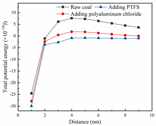 It can be observed from Figure 5 that van der Waals energy is beneficial to the agglomeration of particles. With the increase in the distance between particles, van der Waals energy gradually decreases, and the influence on particle aggregation becomes smaller and smaller. Electrostatic energy is repulsive energy, which makes the particles disperse and is unfavorable to the agglomeration of particles, and the electrostatic potential energy also decreases with the increase in particle distance. The coagulant added in coal slime water can generate positive ions, neutralize the surface charge of particles, compress the electric double layer, reduce the electromotive potential and repulsive force and then cause coagulation. Compared with the data and curves of the above three groups, it can be observed that when polyaluminum chloride and PTFS are added, their electrostatic energy will be significantly reduced compared with raw coal, and the latter electrostatic energy will be reduced more, which also proves theoretically that the coagulation effect of PTFS is better than that of polyaluminum chloride.