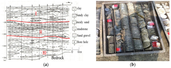 Quaternary geological structure map of the Huainan mining area: (a) I—Upper loose diving layer; II—pressurized water isolated layer; III—lower confined aquifer, impermeable layer; (b) rock samples obtained by drilling.