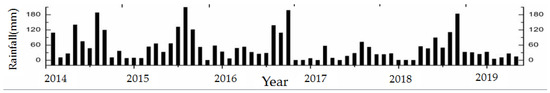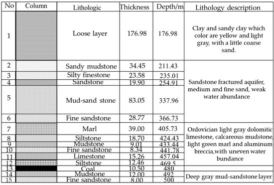 The Huainan mining field is located in the north-central part of Anhui Province, with a good geographical location and convenient transportation. The mining area is about 100 km long, 30 km wide, and covers an area of 3000 km2. Zhangji coal mine is located in Zhangji town, Huainan mining area (see Figure 1). The overlying stratum is a cenozoic loose layer with lower limestone and coal measure strata from the Cambrian, Ordovician, carboniferous, and Permian coal measures (see Figure 2). The 11418(W) working face has a strike length of 212 m and an inclined length of 1260 m, which is arranged along the slope and mined upside down. The average buried depth of the 8# coal seam is 500 m, with an average thickness of 3 m and a 4° average inclination. The geological data and corresponding rock mechanics parameters of the rock mass obtained by drilling are shown in Figure 3, and Table 1. The rainfall and water content of the rock formations are shown in Figure 4 and Figure 5.