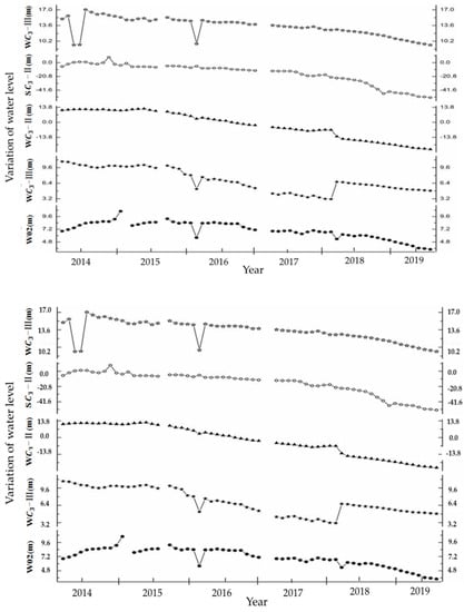 Dynamic change curve of water level of five wind wells in the Zhangji mine field.