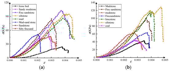 The uniaxial compression stress curve of each rock formation in a physical model: (a) roof slab; (b) coal seam and floor.