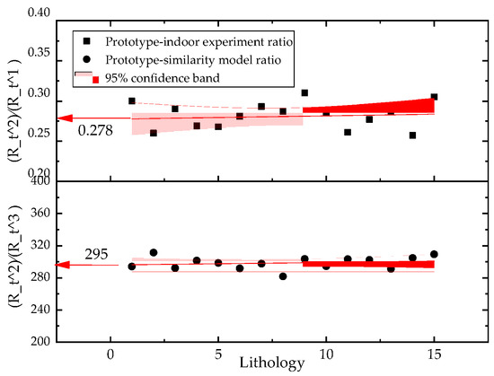 Based on the uniaxial compression strength of the indoor samples meeting the similarity ratio, the tensile strength of similar materials is verified. The results are shown in Figure 8 and Table 5. For tensile strength, the ratio of the strength results of the site rock mass to the indoor rock sample is close to 0.278, and all the ratios are within the 95% confidence interval. In addition, the similarity ratio value of the physical model is close to 295, and all the similarity ratios fall within the 95% confidence interval. It can be considered that the tensile strength of similar materials meets the requirement of strength similarity ratio.