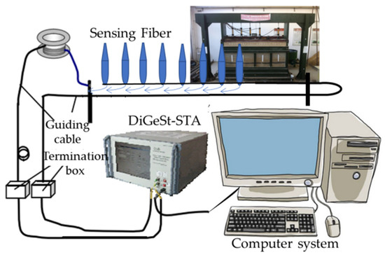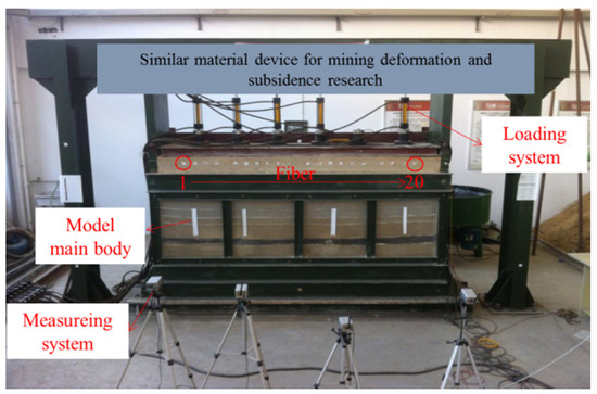 A physical experiment was carried out on a similar material model frame with length 4.0 m, width 0.5 m, and height 2.0 m. The thickness of each rock layer was obtained by synthesizing the field drilling data, and the similarity ratio of the model size, which was premarked on the steel frame on both sides of the model. The rock materials prepared according to the mixing ratio were installed in the model layer by layer according to the order from bottom to top, and mica powder was used as the bedding and joint line between strata, with strain and displacement gauges installed in the corresponding sizes according to the layout drawing of the applied displacement measuring point see Figure 9a, and the fiber optic measuring points which set at the top of the physical mode (see Figure 9b). In Figure 10, the test set-up and sample model after paving are shown.