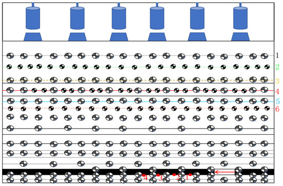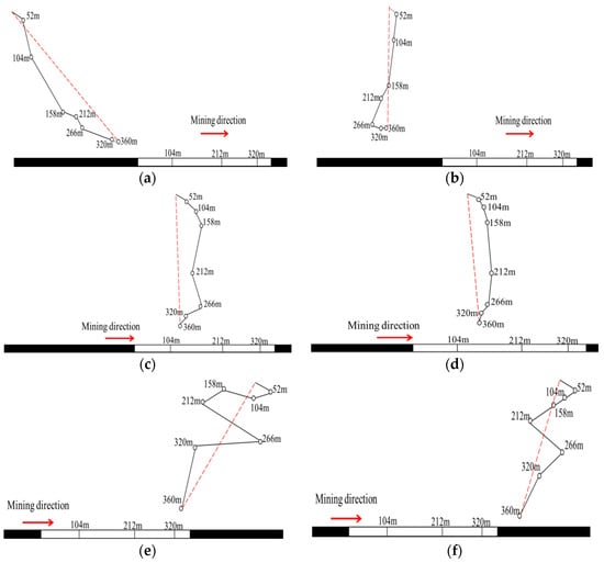 Stratum observation points were arranged at different heights above the coal seam on the model’s surface to explore the movement and transmission laws of the roof strata. According to the change of observation lines, the movement vector of observation points on the model’s surface was drawn. A total of 10 observation lines were installed on the model’s surface, with six observation lines (see Figure 12 and Figure 15) from top to bottom selected for analysing the coal roof movement law. As Figure 18 shows, the sinking and horizontal displacement of observation lines in the physical model were measured and are presented.