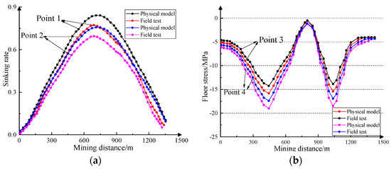 Comparison of stress and subsidence rates of the coal roof in the physical model and the field. (a) Sink rate curves of points 1 and 2; (b) floor stress curves of points 3 and 4.