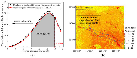 Analysis of optical fiber measuring points and D-InSAR measurement results. (a) Comparison of settlement results; (b) cumulative settlement results of D-InSAR.
