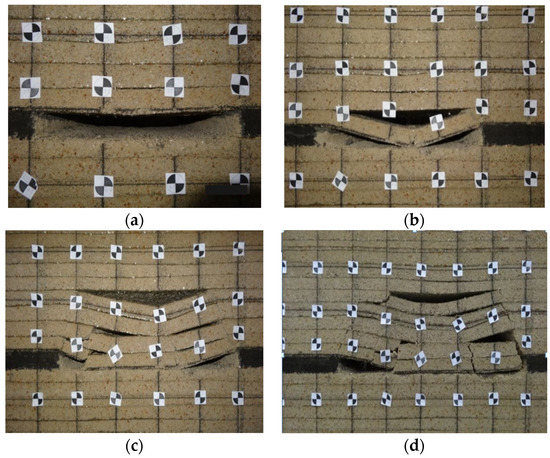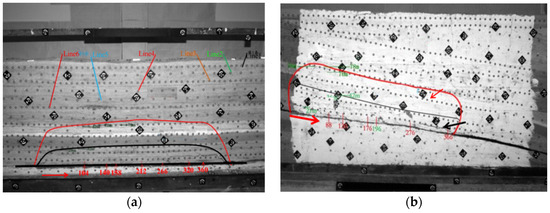After coal mining, new cracks are produced in the overlying strata during the collapse of the lower strata (see Figure 17a,b). Under stress release and gravity after mining, the original cracks in the overlying strata propagate, and new damage occurs. After the cracks propagate and penetrate, the strata collapse, and the fracture angles at both ends of the collapse zone expand upward. Due to the difference in the strength and lithology of the rock formations, the degree of stress release between the rock formations is different, and the collapse characteristics of the rock formations are transmitted upwards. The collapsed rock formations sink to form a rock bridge. The sinking tensile stress and the stress release of the rock formation lead to two collapsed areas, and the inclination angle at the end increases.