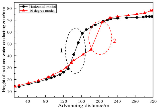 In this experiment, two-angle (horizontal and 10-degree) coal seam models were installed. The stabilized physical model is shown in Figure 15. After the coal seam was thoroughly mined, complicated horizontal and vertical movement and deformation occurred in the upper strata of the mined-out area. The final stable overlying rock layer s underwent different degrees of deformation and failure after mining, which can be divided into three areas: a caving zone, a broken zone and a bending zone. Both the caving zone and fracture zone can conduct water, which is called the water-driving fracture zone. According to the model observation data, the height variation curve of water flowing in the fractured zone during mining is shown in Figure 16. Rock crack development and the settlement formation process in different coal seam mining distances are shown in Figure 17.