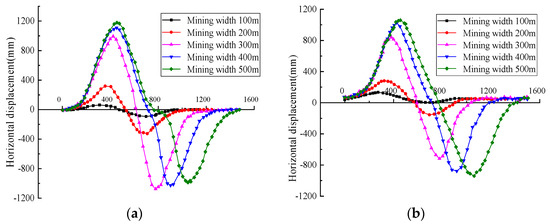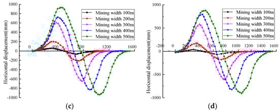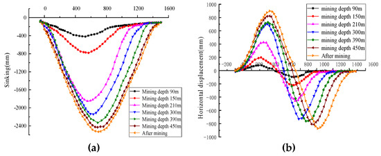 By investigating the normalized settlement and horizontal movement values of the coal seam roof slab, and comparing these with the physical model results, a similar subsidence curve and horizontal displacement were observed (compare Figure 18, Figure 25 and Figure 26). At the same mining depth, the subsidence value and horizontal movement value of the coal roof rock layer increase as the mining width increases, and the corresponding range of the maximum subsidence value increases; the position of the symmetry point of the subsidence curve gradually moves towards the mining direction. Furthermore, the increment value of sinking increases at first and then decreases with a smooth growth at the end, which is consistent with the result of the physical model (compare black line, red line, and blue line in Figure 25a). In contrast, the maximum subsidence value of the coal seam roof decreases with the increasing mining depth under the same mining width. When the mining width is 500 m, the subsidence value (2.92 m) at a mining depth of 200 m is 1.3 times larger than that (2.25 m) at a mining depth of 500 m. The horizontal movement curve presents an antisymmetric characteristic about the goaf’s center, and with the larger mining width (500 m) the horizontal movement reaches a greater value (1.2 m), which is three times bigger than that of 200 m width. In addition, the incremental value of the horizontal movement first increases then decreases at the end, and the final horizontal movement value stabilizes near zero.