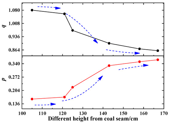 Analyzing the maximum subsidence value of six observation lines, the maximum subsidence coefficient q and horizontal movement coefficient b of the six observation lines were obtained as shown in Table 6. The regression relationship between height from the coal seam and rock subsidence coefficient is shown in Figure 19. It could be argued that the horizontal movement coefficient and the subsidence coefficient develop in a negative correlation with the distance between the rock layer and the coal layer. The movement law of overlying strata in the mining field is transferred from bottom to top, with the peak subsidence and horizontal movement value decreasing gradually in the transfer process. In other words, the subsidence movement deformation increment of the overlying rock layer first increases, then falls, and the deformation of the roof surface reaches a stable level. This observation shows that the original stratum tends to move and deform towards the lower part of the mining area, causing decreased sinking and increased horizontal displacement.