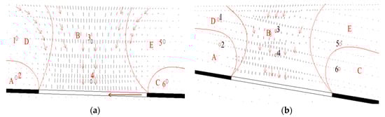 Observing and analyzing rock roof slab movement from the physical and numerical models, complex movement of the upper rock layers result in sinking and horizontal movement (see Figure 20). After the lower coal seam is mined, the stress of the roof rock layer is released, causing the original cracks in the formation to expand, and the rock layer begins to move, sinking and horizontally in the direction of the force. The moving belt can be divided into five parts (see Figure 20). The collapse area formed by the cracking of the lower rock layer triggers the original movement of the rock layer directly above, resulting in larger pull angles at both ends of the rock layer. The rock formations at both ends also gradually move to the previous weakened areas (zones D and E in Figure 20). Compared with the rock formations directly above the goaf, the movement of the rock formations at both ends produces smaller horizontal displacements and shallower surface cracks. On the other hand, in other mining-affected areas (A, C, see Figure 20), the lower coal seam has not yet been mined. The subsidence and movement of the disturbance zone in the upper part of the mined-out area have less impact on the rock formations, resulting in a relatively smaller tensile stress, and a larger final tensile crack angle of the affected area edge. This is because the upper rock layer tends to move toward the lower weakening and subsidence area, and the lower subsidence area cracks closed, forming a trapezoidal subsidence area in the upper part of the goaf center. Therefore, smaller sinking and horizontal strata movement of this area is observed compared with other areas.