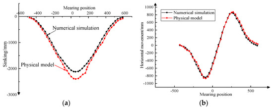Comparison of the numerical model and physical model results. (a) Sinking; (b) horizontal displacement.