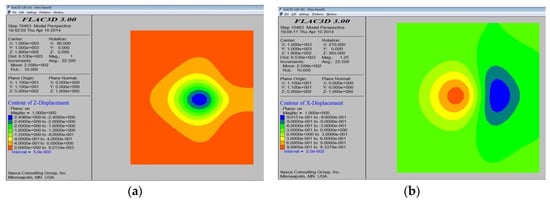Cloud maps of subsidence and horizontal movement in the roof rock layer at the end of mining obtained from the numerical model are shown in Figure 24. Investigating the subsidence of the roof rock upward of the coaf, a symmetrical sinking curve and a center-symmetric horizontal movement curve with the center of the goaf were adopted. The numerical modeling result was smaller than that observed from the physical model. However, the angle was equal on both sides of the upper extraction, which indicates good agreement with the physical model results.