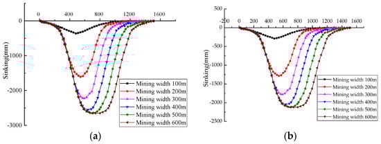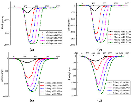 Subsidence curve under different mining depths and widths. (a) Depth 200 m; (b) depth 300 m; (c) depth 400 m; (d) depth 500 m.