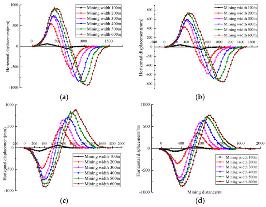 Horizontal movement curve of the rock formation at four angles. (a) Dip angle 0°; (b) dip angle 4°; (c) dip angle 10°; (d) dip angle 20°.