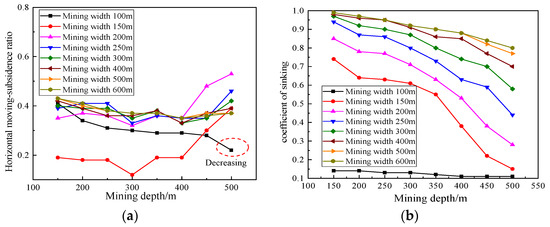 With a greater coal inclination, the peak subsidence value under the same mining width is smaller. The mining distance corresponding to the maximum subsidence value gradually deviates from the center of the goaf to the uphill direction. The symmetry of the subsidence curve is not obvious. When the peak of the horizontal movement of the ground surface under the same width is small, the downward curve slope of the downhill direction is greater than that of the uphill direction, resulting in a horizontal movement curve that is no longer symmetrical. The subsidence coefficient decreases with an increasing mine depth, but the horizontal movement factor does not change significantly. However, the horizontal subsidence coefficient increases under a wider mining width (more than 100 m), and a larger mining depth (more than 400 m) (see Figure 29a). In contrast, with a smaller mining width, the horizontal factor decreases along with the increasing depth (see the red dotted circle).