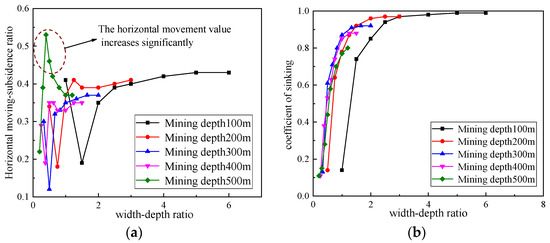 Horizontal moving subsidence and sinking coefficient ratio. (a) Depth 200 m; (b) depth 300 m.