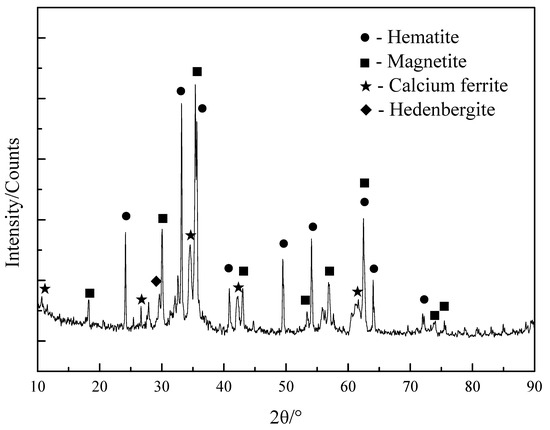 The phase composition of sintered ore tested by an X-ray diffractometer (XRD, D/Max-2500, Rigaku Co., Tokyo, Japan) was shown in Figure 1. The results showed that iron-bearing minerals in sintered ore are mainly calcium ferrite, hematite, magnetite, and hedenbergite. Diffraction peaks at 11.9, 27.6, 34.3, 41.5, and 60.7 reveal the presence of calcium ferrite [35,36]. Diffraction peaks at 33.2, 35.6, 41.0, 49.5, 54.1, 62.5, 64.1, and 72.0 of the sintered ore are observed, which reveal the presence of hematite [37]. Diffraction peaks at 30.1, 35.4, 43.1, 53.4, 56.9, 62.6, 73.9, and 75.0 of the sintered ore are observed, which can be attributed to the characteristic peaks of Fe3O4 [38]. Diffraction peaks at 29.5, 29.7, 35.0, and 35.3 of the sintered ore are observed, which reveal the presence of hedenbergite, which refer to JCPDS (Joint Committee on Powder Diffraction Standards) (01-071-1500).
