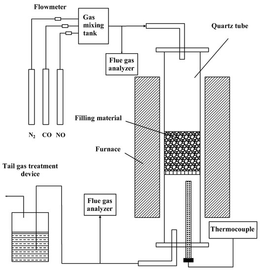 Catalytic reduction experiments are carried out in a tubular reduction furnace, and the experimental system is shown in Figure 2. It mainly includes three parts: gas distribution device, reaction device, and flue gas measuring device. In the gas supply system, the gas is stored in the high-pressure gas cylinder, and the flow is controlled by the rotor flowmeter. After the gas is mixed evenly in the mixing tank, it is passed into the reaction system. The reaction system is mainly composed of a quartz tube holding sinter catalyst and a reduction furnace. The inner diameter of the quartz tube is 35 mm, and the height is 700 mm. The gas used in the distribution system includes four kinds of gas, NO, CO, O2, and N2, which are, respectively, configured by high-pressure gas cylinders, controlled by glass rotor flowmeter, and mixed by a mixer and then passed into the quartz tube in the tubular reduction furnace. The composition of the gas in the high-pressure gas cylinder is as follows: NO standard gas (NO concentration is 10 vol%, balance gas is N2), CO standard gas (CO concentration is 10 vol%, balance gas is N2) (provided by Wuhan Newred Special Gas Co., LTD., Wuhan, China), O2 standard gas (purity 99.9 vol%), and N2 standard gas (purity 99.9 vol%) (provided by Wuhan Minghui Gas Technology Co., LTD., Wuhan, China).