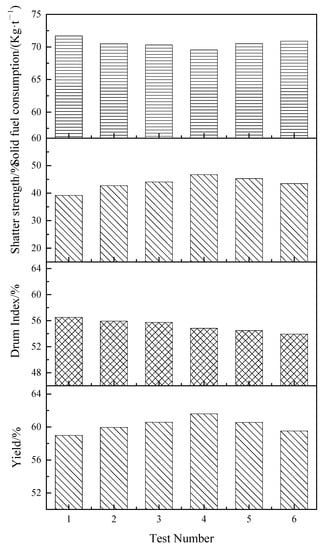 After sintering, the indexes were tested, including particle size composition, yield, drum index, and fall strength. The testing criteria are as follows: (1) particle size and particle size composition test refer to ISO4701; (2) refer to GB8209-87 for strength test of drum; (3) standard test of shatter strength (refer to JIS8711-77); The calculation methods of these sintering indices are shown in Table 6.