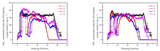 As shown schematically in Figure 7, Figure 8, Figure 9 and Figure 10, in contrast to the single-layer sintering, NOx concentration under the 16% baseline oxygen content () in the flue gas of double-layer ignition sintering is reduced to a certain extent. Under the conditions of layer height proportion of 320/400 mm (lower/upper), with the extension of the ignition time interval, the total sintering time increases gradually, increases, and the generation time of nitrogen oxide also increases gradually, indicating that the extension of the ignition time is not conducive to the emission reduction of NOx in the whole sintering process. When the ignition time interval is 5 min, in the early stage of double-layer ignition and sintering process is slightly lower than that of single-layer sintering, and the generation time of NOx is greatly shortened. This is because, in the process of double-layer ignition and sintering, the upper and lower sintering material layers are sintered down at the same time, resulting in the overall sintering time is greatly shortened. The NOx generated in the upper sintering process are partially decomposed and reduced when passing through the lower sintering combustion zone, which reduces the emission of nitrogen oxides [4]. At the same time, the oxygen content in the upper sintering flue gas is low and contains a certain concentration of CO and a large amount of CO2, leading to a reduction in NOx production in the lower sintering process [47,48]. Metal oxides in sinter, such as Fe2O3, Fe3O4, and calcium ferrite, have different degrees of catalytic effect on the removal of NO by CO reduction [35,40,49]. When the ignition time interval is extended to 10 min, the formation time of nitrogen oxide is gradually prolonged, which is due to the late ignition time of the upper sintering, while the lower part has been a large part of the sintering, and the material permeability of the lower layer is gradually reduced, resulting in the upper sintering speed slowed down, so the overall sintering time is longer than the ignition time interval of 5 min.