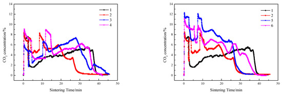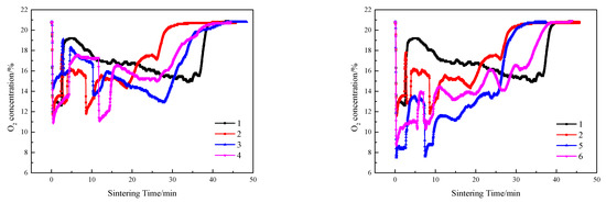 Compared with single-layer sintering, the CO2 concentration in flue gas of double-layer ignition sintering was higher, and the O2 concentration was lower. In the early stage of sintering, because only the lower sintering process was carried out, the height of the material layer was lower, the permeability of the material layer was better, and the fuel combustion rate was increased. When the upper layer was ignited, the sintering processes of the upper and lower layers were carried out at the same time, the permeability of the sintering material layer decreased, resulting in a decline in fuel combustion rate, and upper sintering flue gas entered the lower sintering, which caused the lower sintering of oxygen to decrease, the content of CO2 and CO to increase, the oxidizing atmosphere in the sintering material layer to weaken, and the lower combustion zone to form a local reducing atmosphere, which has a significant effect on decreasing NO [50]. The NOx in the material layer is reduced and decomposed by CO under the catalysis of the hot sintered ore, thereby reducing the emission concentration of NOx [4]. At the same time, CO generated by sintering in the upper layer is burned again and consumed by REDOX reaction when passing through the lower layer sintering process; therefore, the content of carbon monoxide in the flue gas of double-layer ignition sintering is lower.