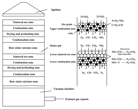 A possible mechanism for the degradation of NOx by double-layer ignition sintering is shown in Figure 11. This study changed the traditional single-layer ignition sintering to double-layer ignition sintering. In the double-layer ignition sintering process, the upper and lower sintering materials are sintered at the same time, and two combustion zones exist at the same time, which increases the width of the combustion zone inside the entire sintering material layer. The oxidizing atmosphere in the upper sintering flue gas is weakened, and the high-temperature hot sintered ore in the lower layer provides favorable conditions for catalytic reduction of NOx. The use of sintered ore to catalytically reduced the NOx in the flue gas at high temperatures enables the NOx in the upper sintering flue gas to be reduced and decomposed when passing through the lower combustion zone. At the same time, when the upper layer sintering flue gas with lower oxygen content passed through the lower layer sintering, the NOx conversion rate of the lower layer sintering fuel was reduced, thereby reducing the nitrogen oxide concentration during the entire sintering process.