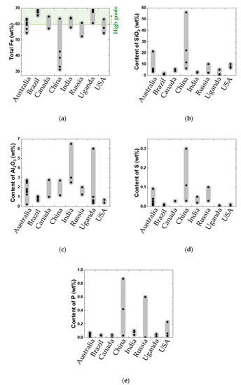 The quality of raw iron ores is determined mainly based on chemical composition. In particular, the higher the total Fe content, the higher the iron ore grade. Furthermore, low amounts of gangue materials and impurities also result in a high grade. In the present study, the chemical composition of three typical iron ores, namely Mining Area C (MAC), Yandi, and Carajás (supplied by Hyundai Steel), was investigated. Table 2 lists the chemical composition of iron ores produced in various countries [2,4,24,25,26,27]. The total Fe content of iron ore varies from 31 to 69 wt%. SiO2 and Al2O3 are mainly present as gangue components in iron ore, and their content is in the range 0.35–56 and 0.23–6.5 wt%, respectively. Furthermore, sulfur and phosphorus concentrations are in the range of 0.001–0.3 and 0.004–0.87 wt%, respectively. Figure 1 shows a comparison of the chemical composition of iron ores between different countries. High-grade iron ores with total Fe content exceeding 60 wt% [28] are found in Brazil, Canada, and Uganda. In the case of Australia, India, the United States, and Russia, the ore grade is around 60 wt%. In particular, iron ores found in China have a disadvantage in terms of the total Fe content, apart from typically having high SiO2, phosphorus, and sulfur content. Iron ores from China may also contain TiO2, which may cause TiC formation during blast furnace operation [29]. These geological characteristics of Chinese iron ore originate from the nature of banded iron formation (BIF) [2,4]; in low-rainfall areas, the ore remains unenriched and therefore contains high concentrations of impurities. Iron ores from India and Uganda are characterized by high total Fe and Al2O3 content. In iron ores from Russia, phosphorus and sulfur content are relatively high. Steel mills blend various iron ores to obtain sintered ore of uniform quality.