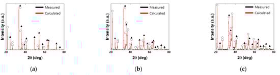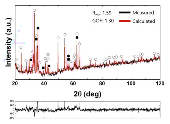 Examples of an XRD pattern and a Rietveld analysis result for a synthetic iron ore sinter (Sample #6 in Table 5; ○: Fe2O3; ●: Fe3O4; ◇: SFCA; △: C2S; ◎: FeO; ■: Al2O3) [50].