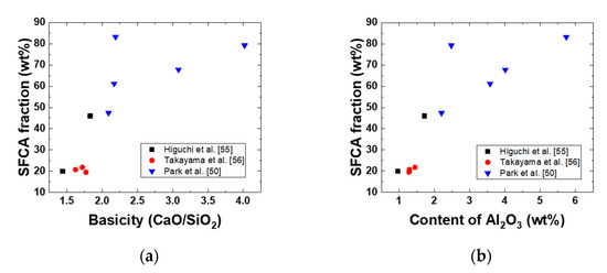 In Table 5, chemical compositions and phase fractions of iron ore sinters are listed; the chemical compositions and fractions were determined through Rietveld analysis [50,55,56]. Figure 6 shows the effects of basicity (CaO/SiO2) and Al2O3 content on the SFCA fraction in the iron ore sinter. With increasing basicity or Al2O3 content, the SFCA fraction increased. However, to obtain a suitable microstructure of the iron ore sinter, the basicity and Al2O3 content should be optimized.